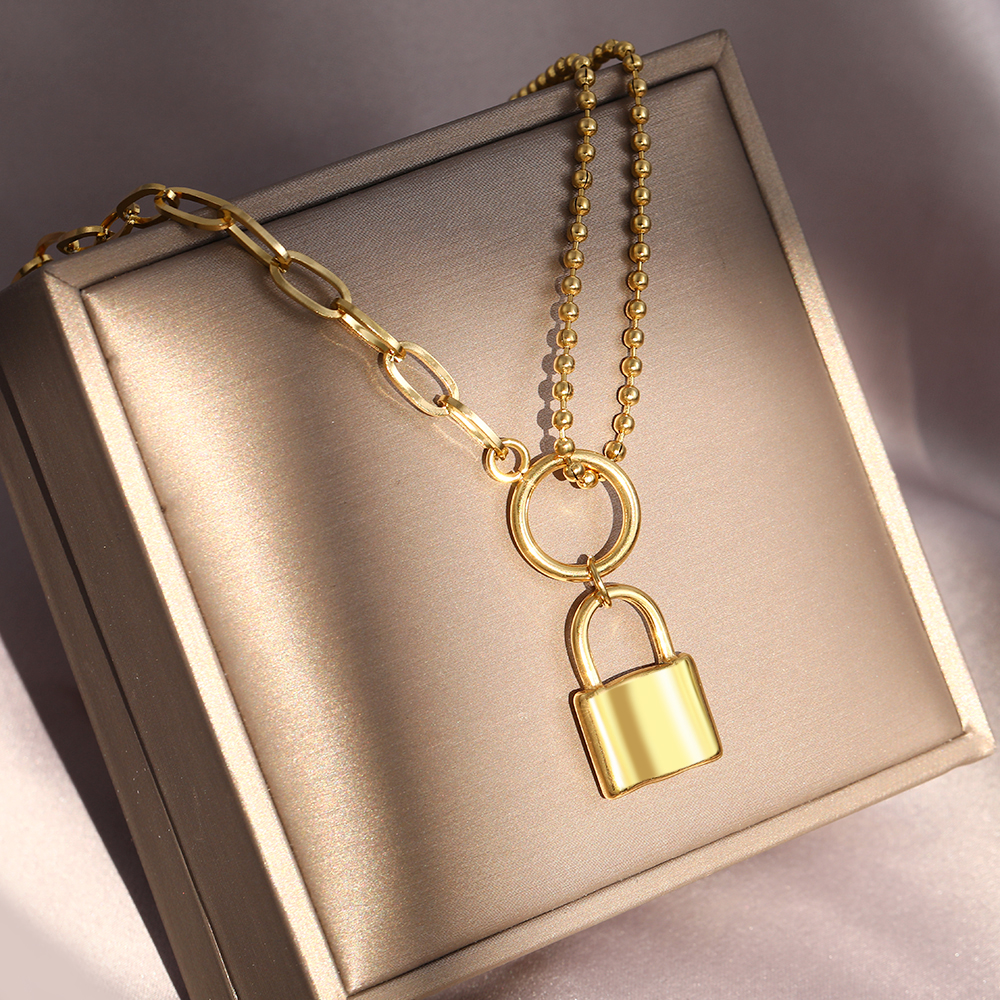 Stainless Steel Necklaces Grunge Gothic Lock Pendant Thick Chain Asymmetric Unique Choker Necklace For Women Jewelry Gold Color – Sumsfashion